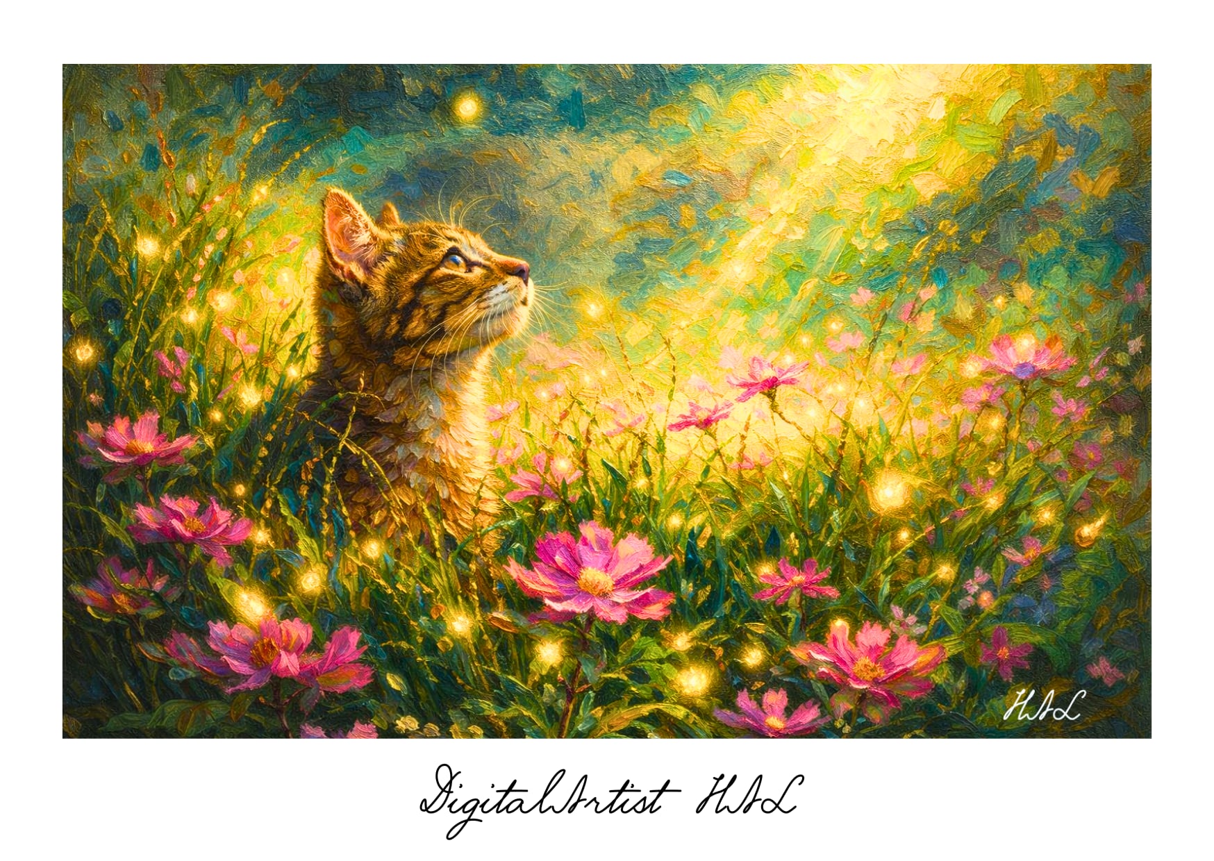 光に包まれる花畑の猫 〜きらめく癒しのひととき〜|ポストカード