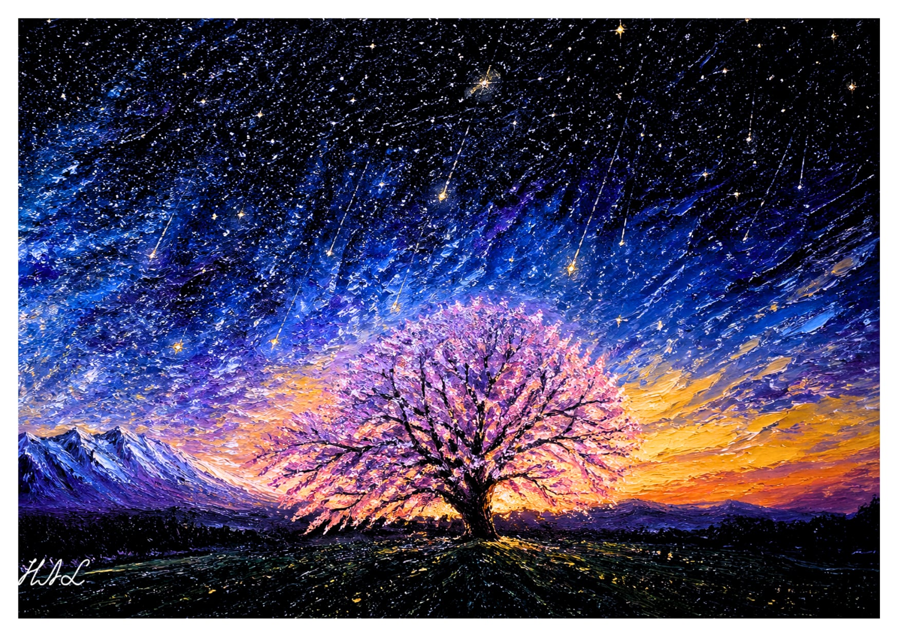 小岩井農場の一本桜が幻想の光に包まれる